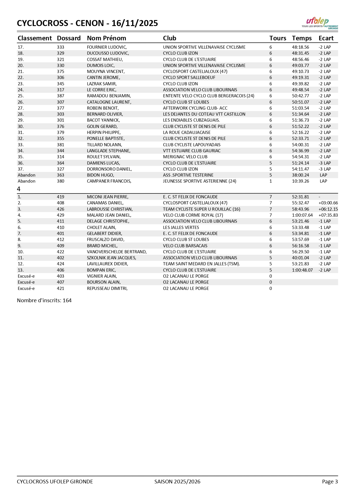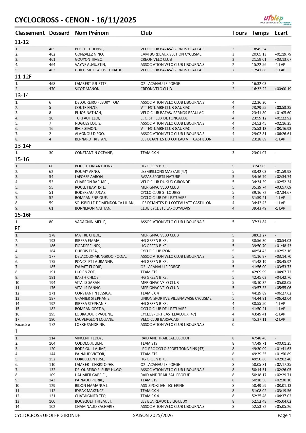 Et enfin merci à toute l’équipe de la CTD de cyclocross de l’UFOLEP33, à Sandrine Manet qui nous a assuré le chronométrage, à Dédé Musiol le speaker qui nous a animé comme toujours et de fort belle manière toutes les courses et à nos amis Bernard Soteras, Alban Cordoba et Xavier Rodet qui ont réalisé de magnifiques photos.
