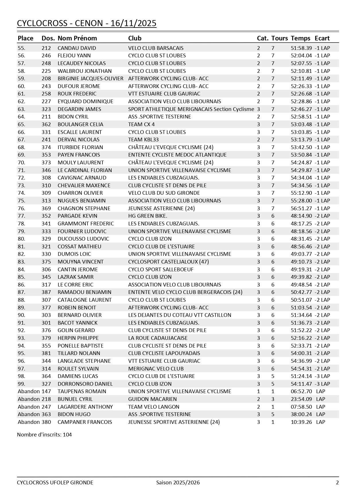 Cette 10ème édition du cyclocross du parc Palmer à Cenon a vu de nouveau un record de participation puisque nous avons compté 168 concurrents dont 26 jeunes et 17 féminines + 32 enfants qui ont pu s’initier à cette discipline. Merci beaucoup à toutes et à tous les coureurs pour leur participation.